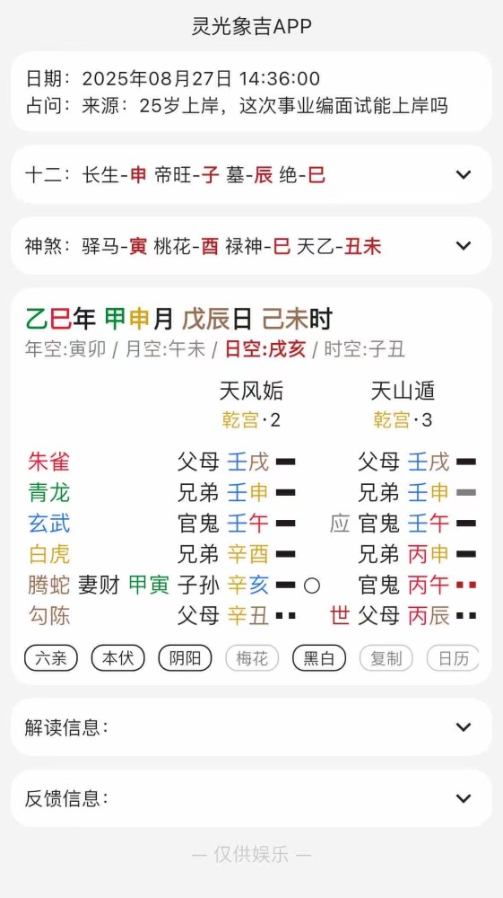 Aye Captain! 感觉重点在上爻戌土,朱雀父母戌土,暗动墓官,官又是应爻又是所测之事,父母朱雀又很像面试。如果这个父母朱雀是用神,是卦主的父母,我感觉就可以断过了,不是自己的指的是同类竞争者就无了。 这里间爻发动,还是个子孙,还化午与官相刑,又是空化官,整体有点“下次一定的感觉”,所以我认为上爻那个戌土指的是竞争对手,所以这次过不了。 再看🤏细节,飘一下,面试过程中,一些比较偏向于场景类问题的题答得不够好,发散的不够,给出的解决方案相对缺乏。可能把这类题型练好就没问题了。