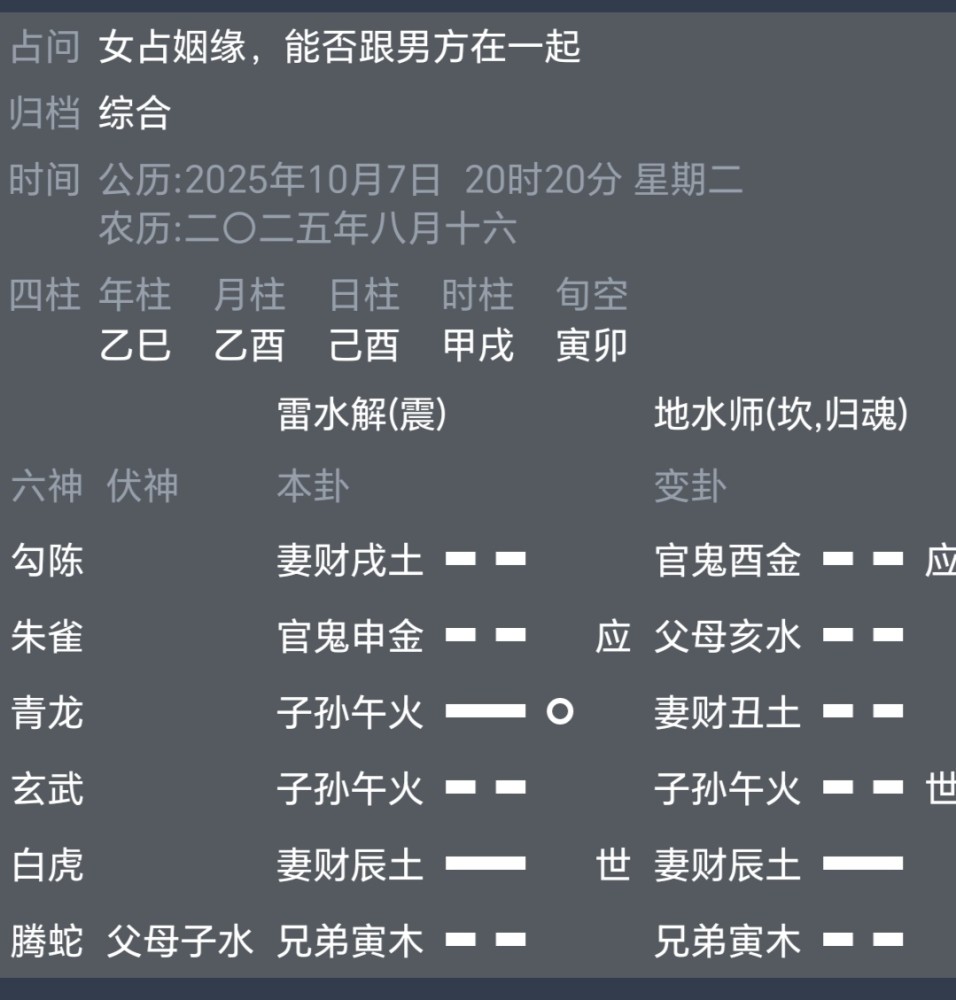 泥菩萨 应爻官鬼申金,世爻妻财辰土,看这样女方还是对男方比较满意。而且官鬼申金日月旺相,说明男生条件不差。世爻被日月上的官鬼酉金日月双合,代表可能女生长久以外都有一个择偶标准,虽然男生比较优秀,但是里卦主的标准还是稍微差一丢丢。男生元神两现,上爻勾陈妻财戌土与二爻白虎妻财辰土,元神互冲,代表比较纠结,对感情这件事还是没有一种很明确的感觉,还在抉择选择过程。本卦一爻独发子孙午火化妻财丑土克官鬼申金,感觉最后两个也不会在一起,男生会找一个比较漂亮的女生在一起。