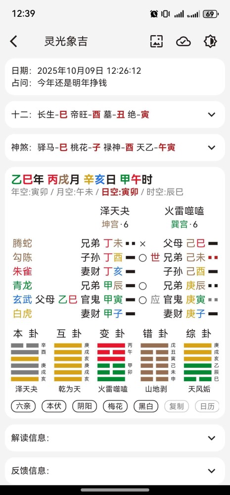 YYDS “归墟·观影”官号 内卦伏吟,辰土合世爻,寅木合亥水,一起伏吟,这个代表卦主纠结,内忧之象,辰土月建相冲为破,寅木旬空,这个焦虑的状态可以去除了。子孙酉金持世,旺象,元神持世,化未土回头生,上爻未土化巳火回头生,未土又生酉金,酉金生妻财亥水,断吉,今年卖可能比较好