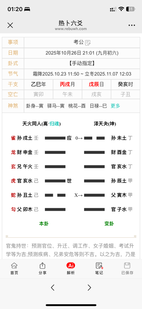 上爻子孙旬空发动,根据背景分析,卦主考试时间,临月,力量还是很强大的,旬空但发动,不为空,但有空的本质,可能是有点想泄气了,而且这个爻发动是化退,日辰冲爻,冲之愈动,两个方面佐证,最后一股气,卦主要好好保持这个状态。
