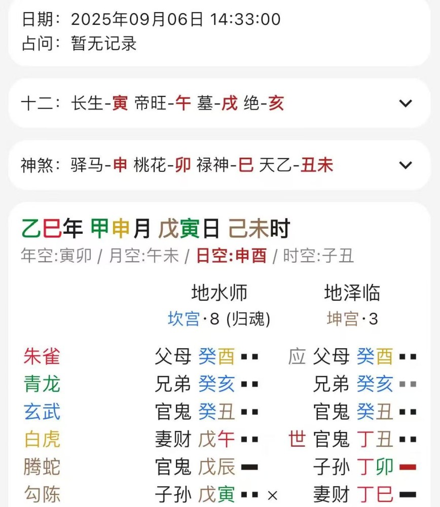 YYDS 三里 妻财午火为用神 妻财午火持世,月建休囚,日辰相生,旺象 应爻酉金父母,月建相扶,日辰不帮扶,旬空 兄弟亥水,月建相生,日辰相合,旺象 子孙寅木,月建相冲,临日辰,发动化出妻财巳火 寅木发动去生世爻妻财午火,自己又化出一个妻财巳火,能得财,断吉 寅木为世爻元神,跟巳火和月建申金行成三刑,表示卦主对工资能不能全部发放这个事,内心是煎熬的,有麻烦的。寅木虽然月破,但是临日辰,发动化出妻财巳火,巳火跟月建相合,世爻持午火,最终发放的工资化退,卦主能得到部分工资