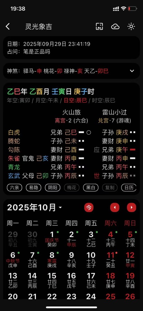 巳火申金跟日辰行成三刑,巳火为世爻元神,自己元神旬空,居6爻,化出的戌土跟世爻相冲,表示卦主自己内心的折磨和纠缠。暗动的申金生伏藏的官鬼亥水,申金代表卦主所买之笔,临朱雀,这个笔应该是那种比较绚丽多姿的,但可能卦主更想买的是应爻酉金那种笔