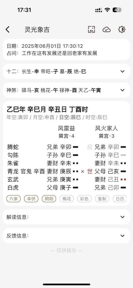 初爻为老家,父母子水看可以作为对比项。不过子水如果是家乡,子水并没有特殊项去表达家乡这样的工作就业机会少的含义,反而还比亥水更甚一筹。和实际对应起来并不是很贴切。 应爻兄弟也是平平无奇。 未土暗动,墓应爻。但是并没有特别明显的作为老家的信息表达。 只能说应爻入墓,老家的信息了解并不明朗。