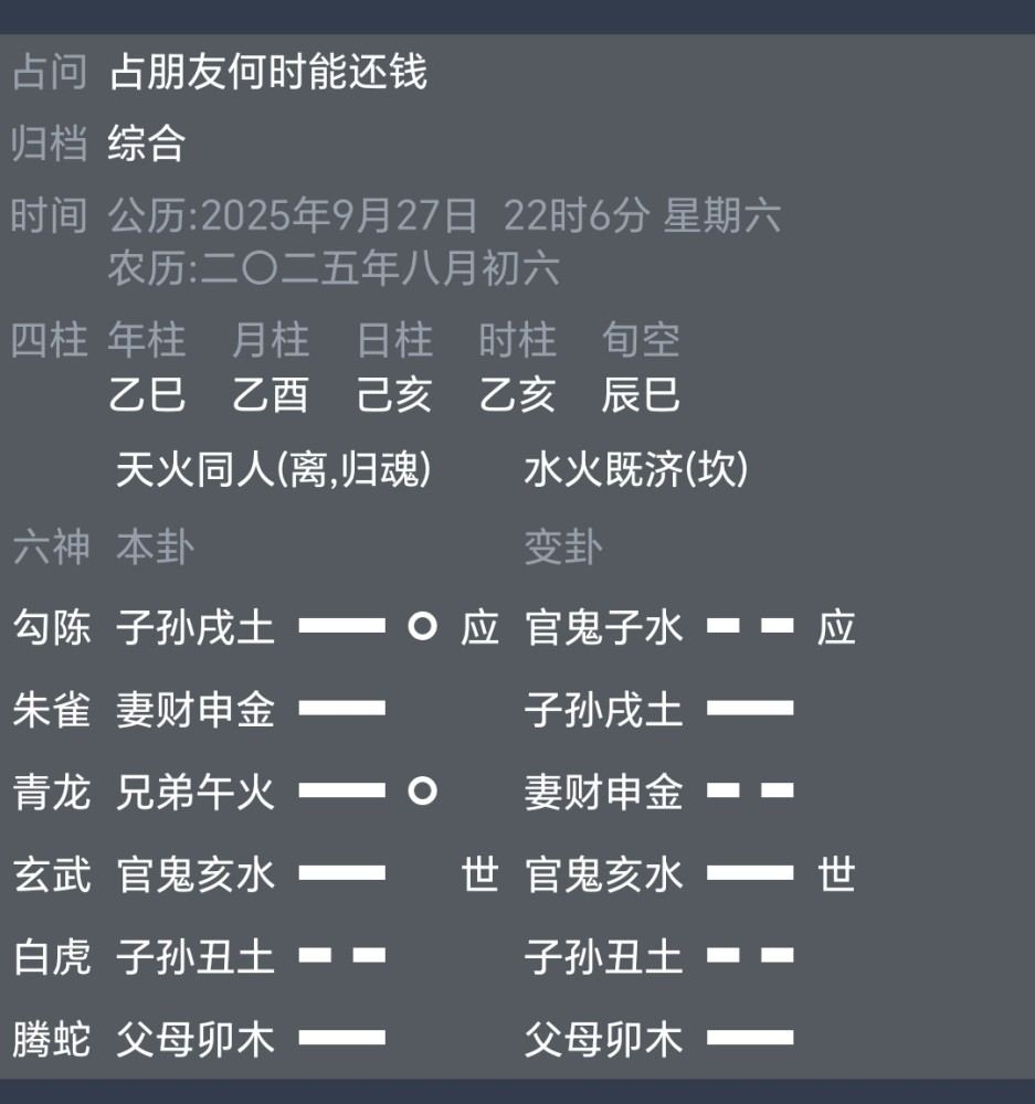 世爻为自己,应爻为对方,本质不变,土克水,变爻也是,水克火,再看应爻为子孙戌土,临勾陈,勾陈主土,有失信的象,化官鬼子水,虽然临月生临日扶,可以看成是对方把这个钱花在了娱乐上面,或者说花在自己身上,土生五爻金,临朱雀,主火,他是来找你借钱,刚开始跟你说会还,但是朱雀又有有始无终的象,且为外卦,说明这个钱现在在他手上,三爻兄弟午火化妻财申金,这个妻财申金可以看成是五爻的妻财申金,在本卦中兄弟午火又去克妻财申金,用神可以取妻财爻,被月扶,但是有人克,神兆机于动,所以不好,元神土,仇神火,火生土,土生金,但是这个又是在外卦的妻财,本卦为天火同人,内卦生外卦,变卦为水火即济,外卦克内卦,断个凶吧
